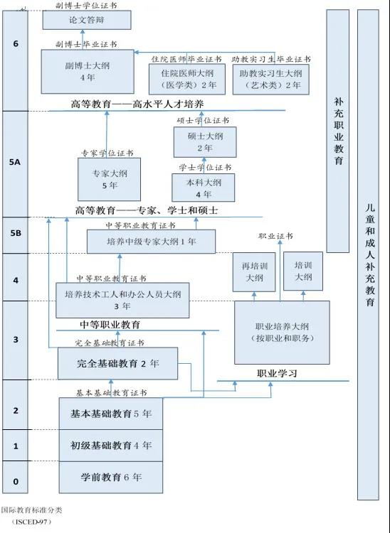 根據新版《俄羅斯聯(lián)邦教育法》,俄教育主要包括學前教育、基礎教育、中等職業(yè)教育、高等教育和補充教育(見圖)。